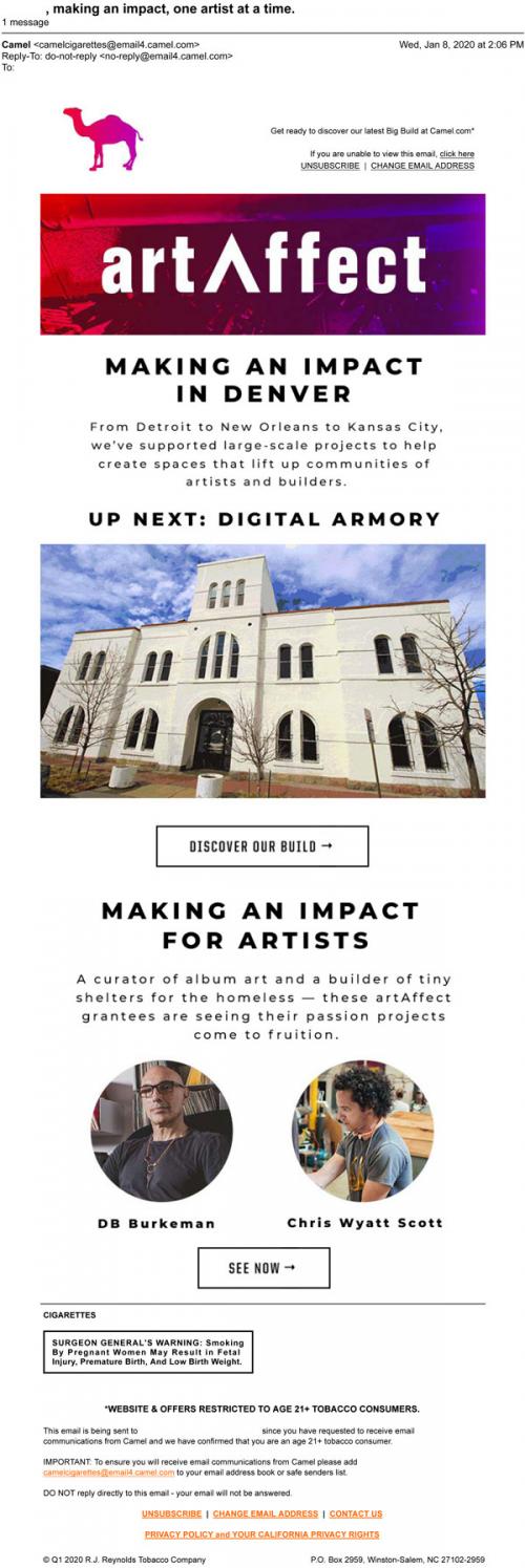 Email from Camel in January 2020 promoting an Art Affect feature on the brand website about a public gallery in Denver. Links to the brand website to learn more about artists supported under this initiative.
