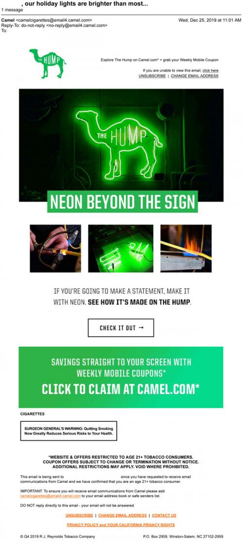 Email from Camel in December 2019 linking to a feature on the Hump about neon lights and a weekly mobile coupon to claim.