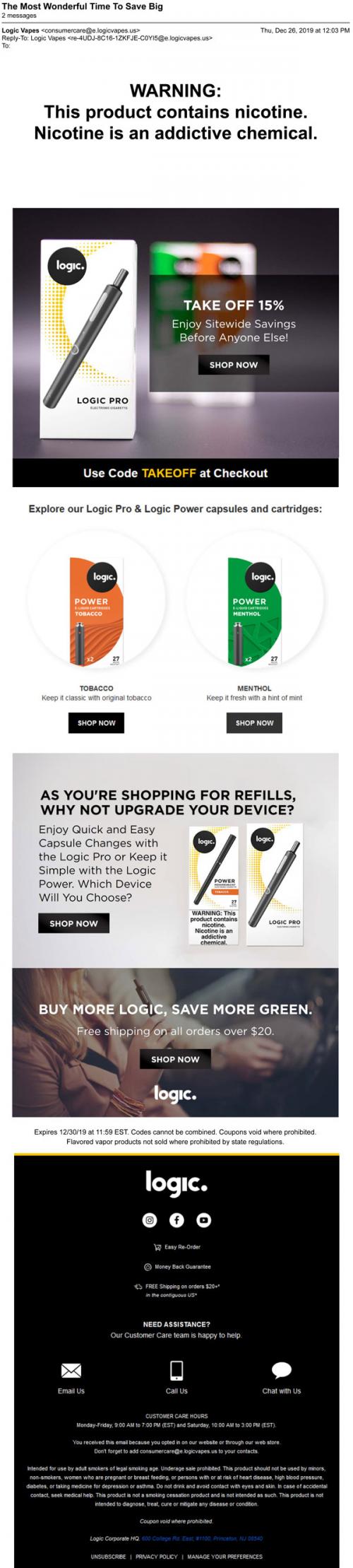Email from Logic in December 2019 promoting a discount sale on the brand website, with a promo code to use.