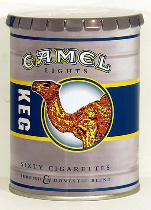 Tin of sixty Camel Lights cigarettes, picture of a chameleon on front and top. Tin is silver and blue with removable lid.
