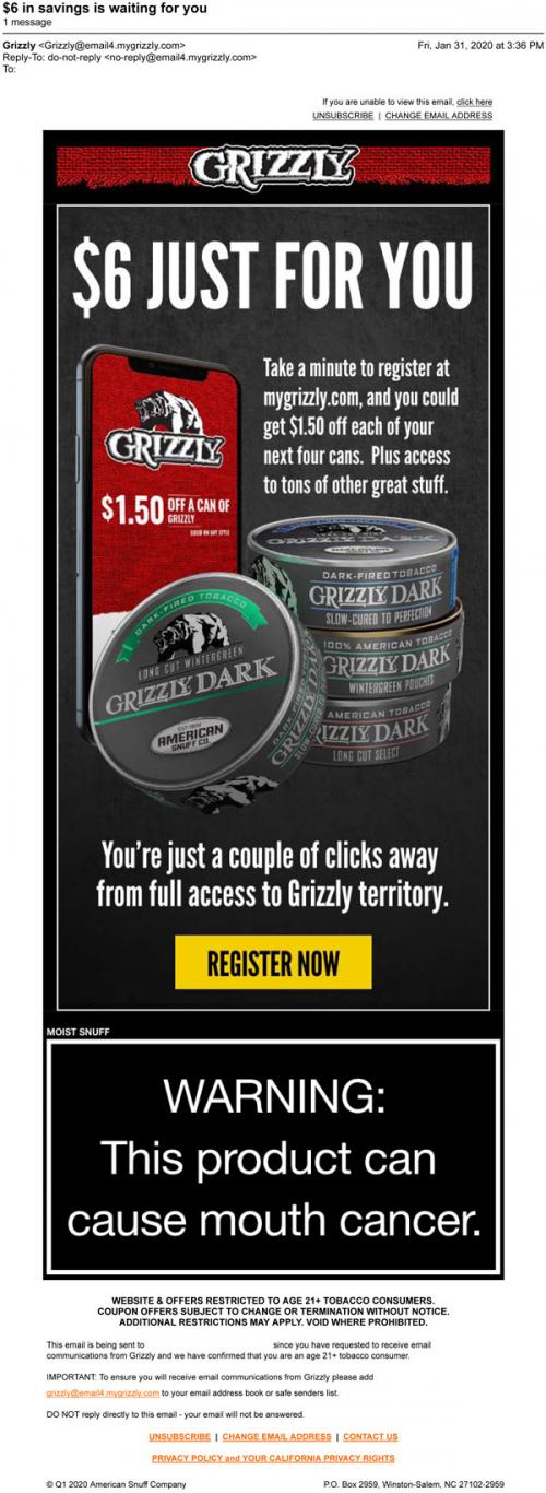 Email from Grizzly in January 2020 reminding the recipient to claim mobile coupons and access the website for other great stuff.