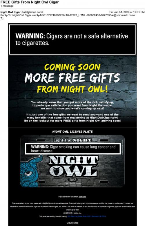 Email from Night Owl in January 2020 letting the recipient know that new free gifts from the brand are being sent out - for instance, a license plate with the brand logo and phrase, "Light the Night."