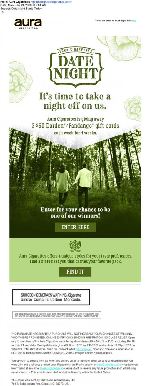 Email from Aura cigarettes in January 2020 advertising their Date Night sweepstakes, with a chance to win dinner and a movie. Provides links to enter and find nearby retail locations.