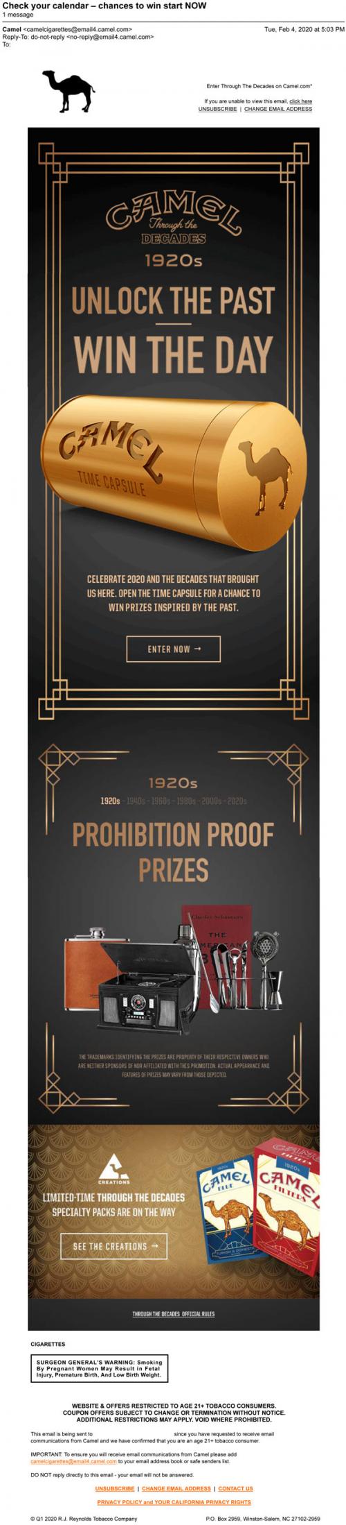 Email from Camel in February 2020 announcing the start of the Camel Through the Decades sweepstakes, with a daily chance to open the time capsule and win a prize. Starting in the 1920s and moving to the 2020s, the brand will have prizes for the highlighted decades. The email also provides a link to check out new pack designs for those decades as well.