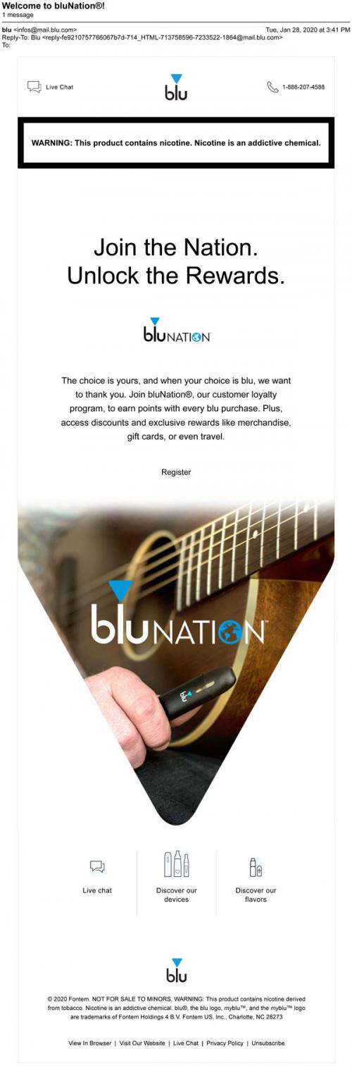Email from blu in January 2020 welcoming the recipient to the brand's Rewards program, bluNation.