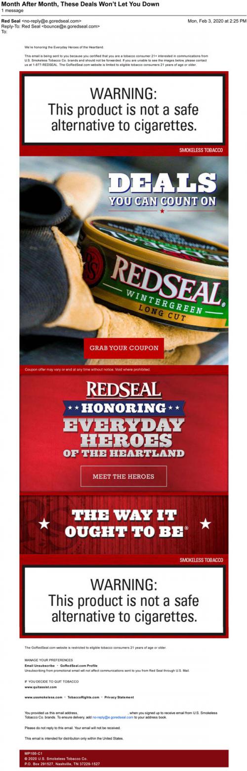 Email from Red Seal in February 2020 with a link to claim a coupon from the brand website. Also includes a link to learn more about the Heroes of the Heartland.