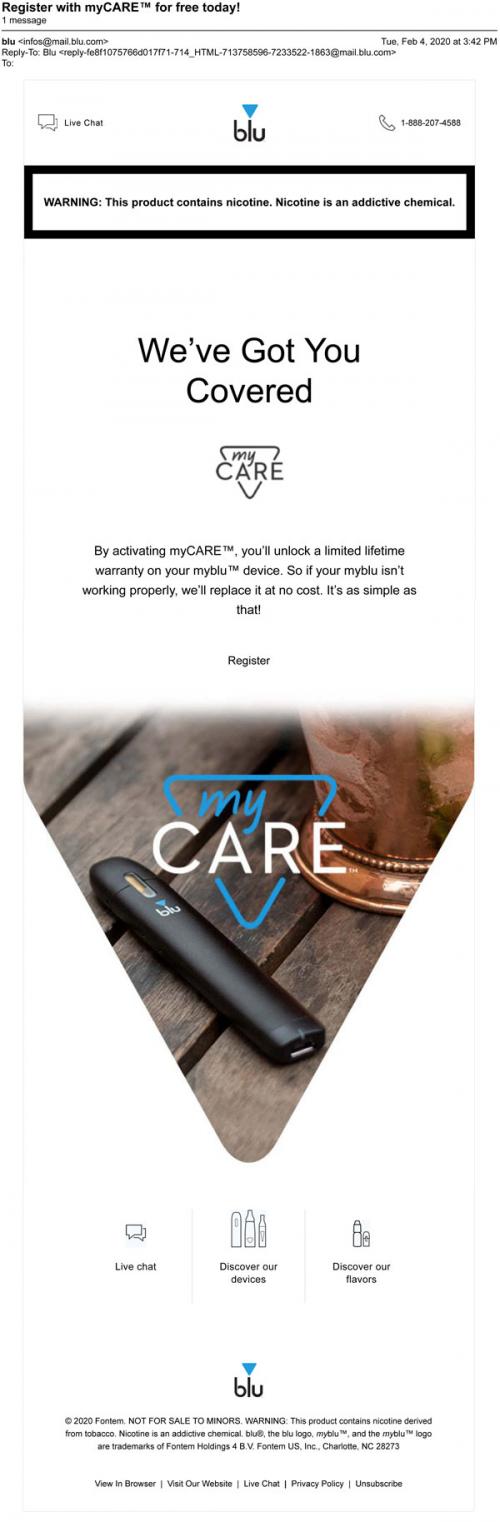 Email from Blu in February 2020 letting the customer know to register for myCare and unlock a limited warranty for their myblu device.