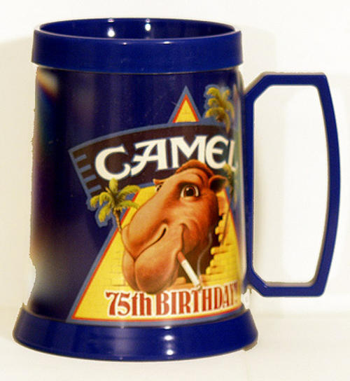 Blue plastic mug with Joe Camel on it, smoking. Words written are "Camel - 75th Birthday!" Design on the back of the mug is the same as the front.