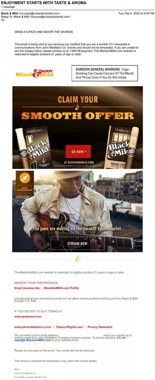 Email from Black & Mild in February 2020 with a coupon offer and a link to stream music on the brand website with the Smooth Vibes playlist.