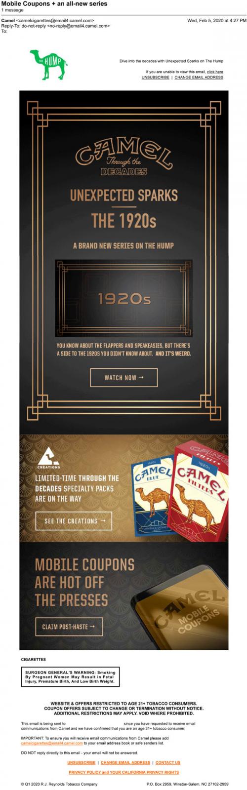 Email from Camel in February 2020 promoting the Through the Decades sweepstakes, with new themed videos to watch. Links to check out limited special packs and claim mobile coupons.