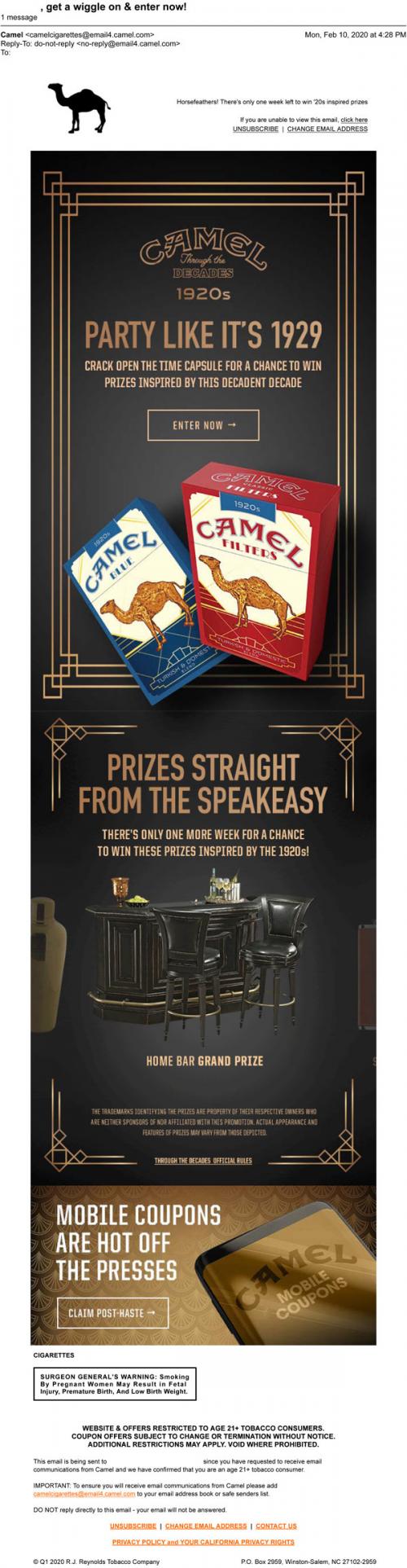 Email from Camel in February 2020 that promotes the Through the Decade sweepstakes, with a link to the brand website to win themed prizes. Also provides a link to claim mobile coupons.