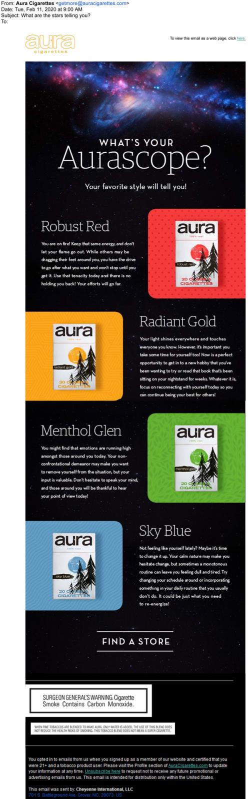 Email from Aura cigarettes in February 2020 showing all their styles with a horoscope to determine traits by favorite blends. Links to find a store on the brand website.