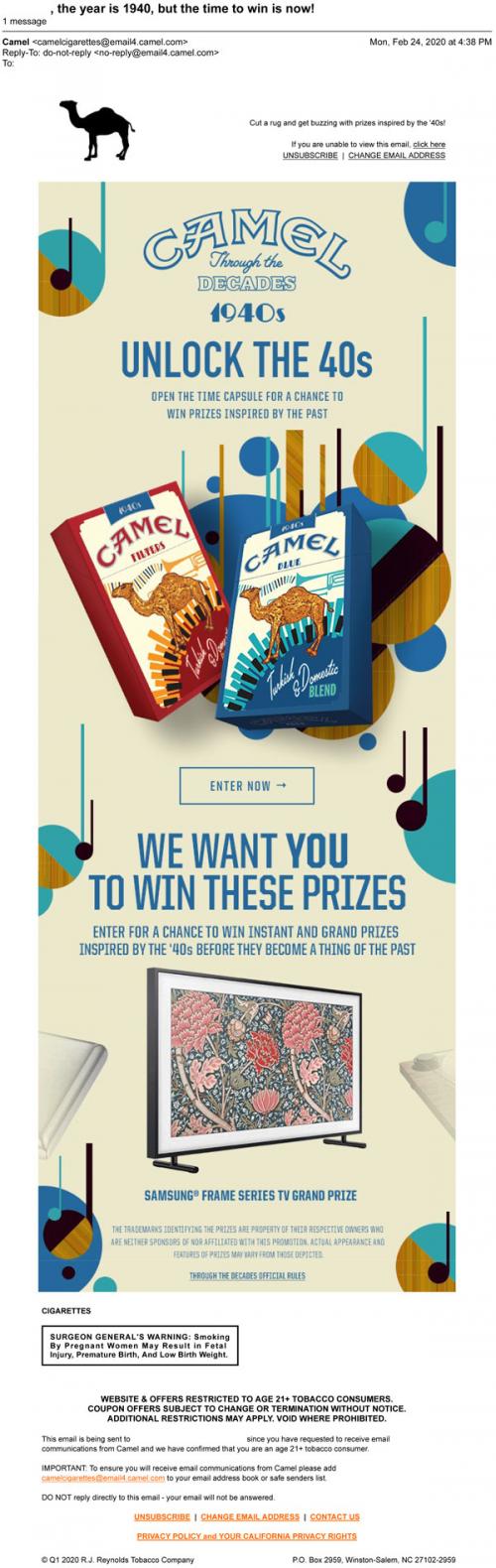 Email from Camel in February 2020 promoting the Through the Decades sweepstakes, with themed prizes. Provides a link to the brand website to enter.