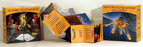Rubix cube like calendar with image of flying camel and camel surrounded by cards and poker chips. Words are written in Spanish.