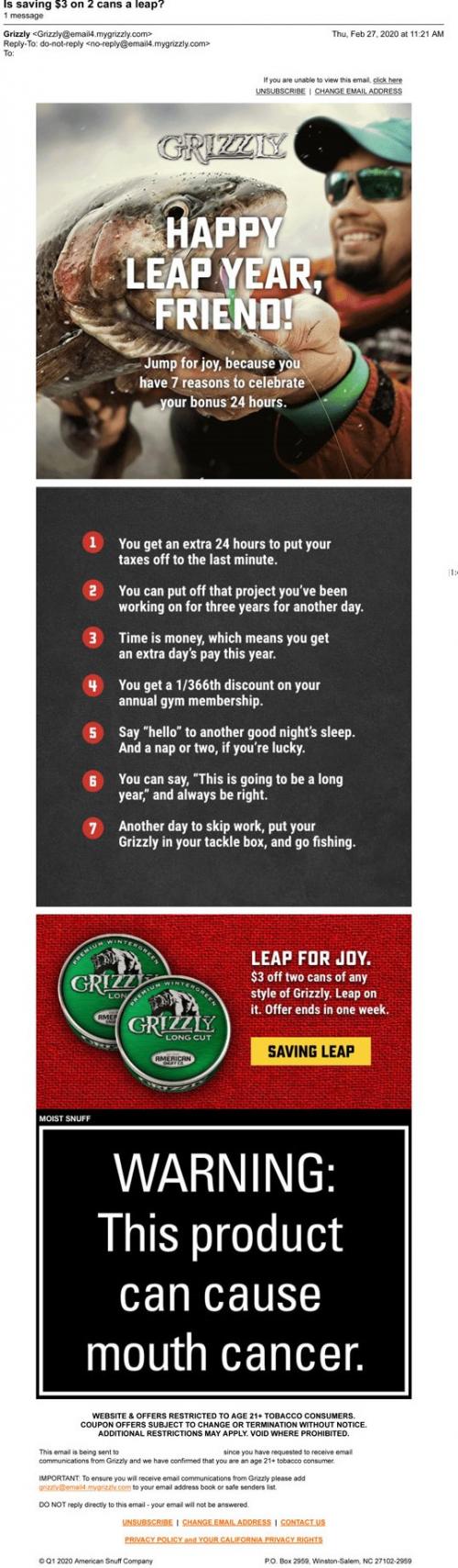 Email from Grizzly in February 2020 with a list of things to do on the extra Leap Day, and an extra coupon available to claim. An animated GIF shows men doing various activities like fishing, lifting weights, and working on an engine.