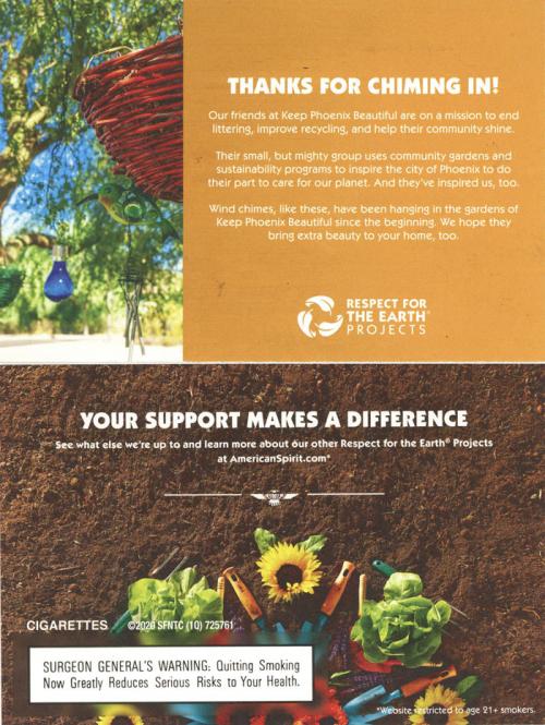 Direct mail gift received from American Spirit in March 2020 as part of a Respect for the Earth project supporting Keep Phoenix Beautiful. The wind chime gift came in a box decorated with soil and gardening implements, and included a card thanking the recipient "for chiming in."