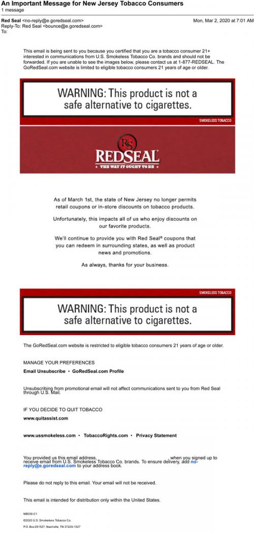 Red Seal email in March 2020 letting the recipient know that recent NJ legislation has banned the use of coupons on tobacco products. The brand assures that they will continue to send coupons the recipient can redeem in other states.