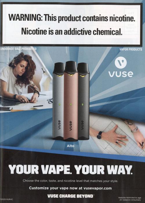 Magazine ad for the Vuse Alto device with the text "Your Vape. Your Way." Invites the viewer to the brand website to "customize your vape."