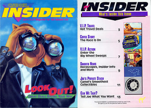 Direct mail, controlled circulation magazine from Camel - Camel Insider, "Joe's V.I.P. magazine for the smooth few" "Lookout! Great deals racing your way." Special magazine for Camel "VIP" members. aslo includes sweepstakes information for a Las Vegas trip, 10 free Camel Cash notes, and a survey.