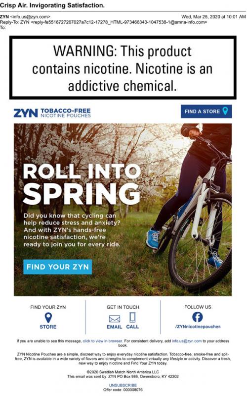 Email from ZYN in March 2020 promoting "hands-free nicotine satisfaction". Includes a link to find a ZYN store.