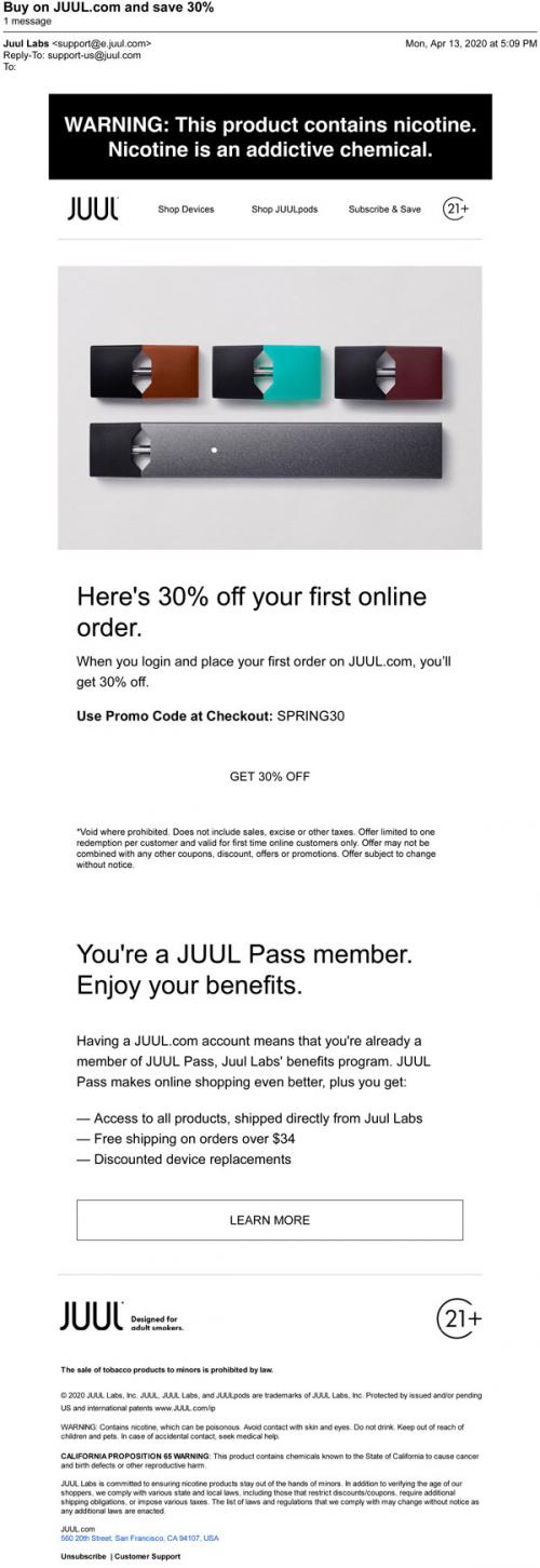 Email from JUUL in April 2020 providing a discount code for 30% off first online order and promoting its JUUL Pass Member benefits.