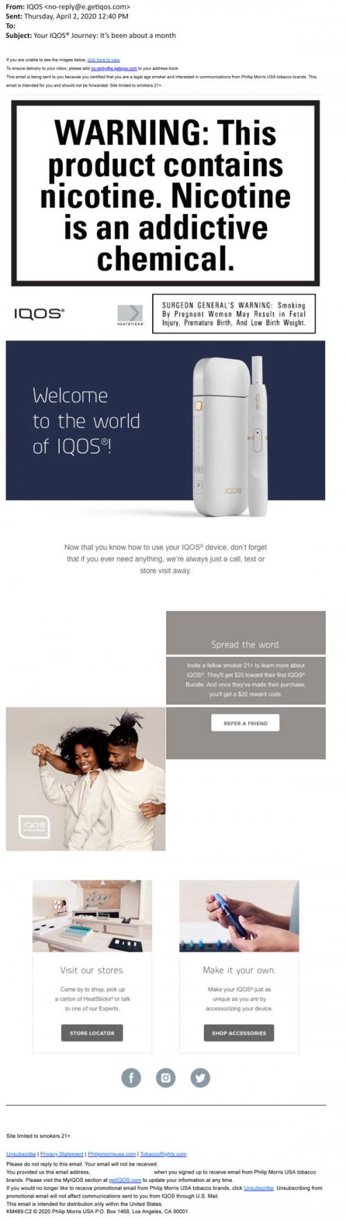Email from IQOS in April 2020 welcoming email subscriber to IQOS. Includes links to refer a friend, find a store location, and shop accessories. Also provides links to check out the brand on social media.