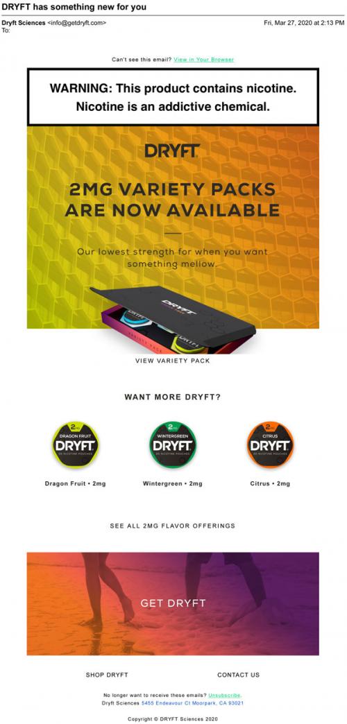 Email from Dryft in March 2020 promoting their 2 mg variety packs.