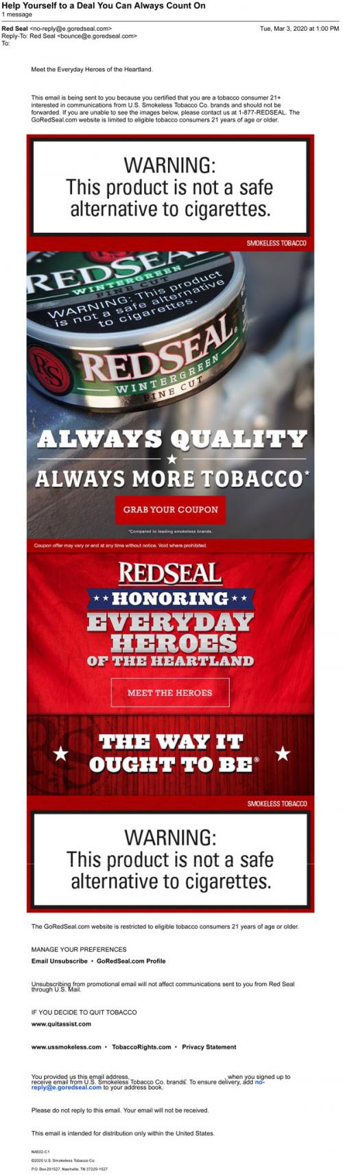 Email from Red Seal in March 2020 promoting its smokeless tobacco with an image of its Wintergreen Fine Cut product, and promoting the Everyday Heroes campaign. Includes a link to a coupon.