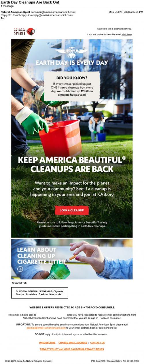 Email from American Spirit in July 2020 promoting an "Earth Day is Every Day" initiative to clean up the environment with their Keep America Beautiful partner. Provides a link to find a nearby cleanup to participate in a local community. Also includes a link to learn more about cigarette litter.