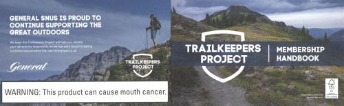 Direct mail received from General Snus in June 2020 that introduces the Trailkeepers Project, part of their environmental partnership with the Leave No Trace Center for Outdoor Ethics. The mailing includes coupons and a handbook about how to be a responsible and respectful hiker and camper. Also includes an LNT sticker to "show your support." Directs the recipient to visit the brand website to learn more and take the official pledge.