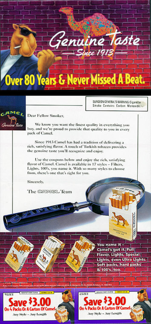 "Over 80 years. Never missed a beat." Direct mail coupons. Save $3.00 off Camel cartons. features Joe Camel.