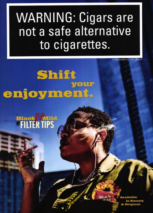 Magazine ad promoting Black & Mild filter tips cigars in sweets and original. Text: "Shift your enjoyment"