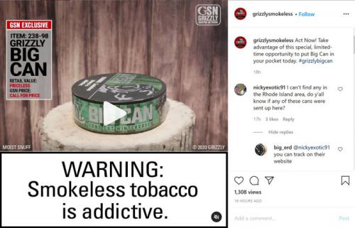 Screenshots from a short video posted on Grizzly's Instagram. The video is a spoof of the Home Shopping Network and promotes their limited Big Can product. The can contains 6 cans of dip and is shown in a model's hands for scale.
