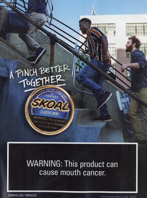 Magazine ad for Skoal featuring a can of their classic mint flavor pouches and a group of men, with the text "A Pinch Better Together."