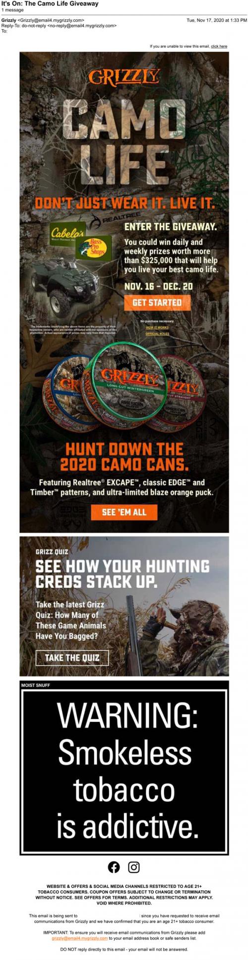 Email from Grizzly in November 2020 that promotes their Camo Life sweepstakes and the accompanying new camo can designs. Provides links to see the cans and enter the sweepstakes. Also includes a link to take a hunting trophy quiz.
