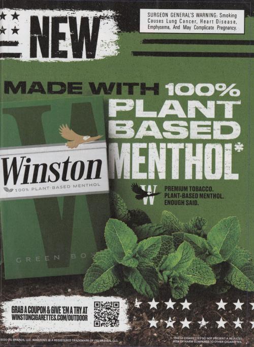 Magazine ad for Winston promoting their new "plant-based" menthol cigarettes, in a green box. Includes a QR code to scan and claim a coupon with a mobile phone.