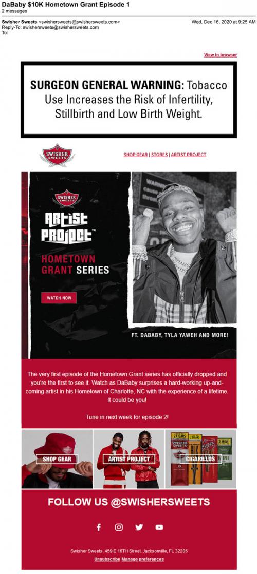 Email from Swisher in December 2020 announcing the first video release in the Hometown Grant series, where musicians under their Artist Project label hand out 10K$ to local up and coming artists in their hometowns. The first video features rapper DaBaby giving away money in Charlotte, NC. Also reminds the viewer to check out the brand on social media and visit their brand website to shop gear.