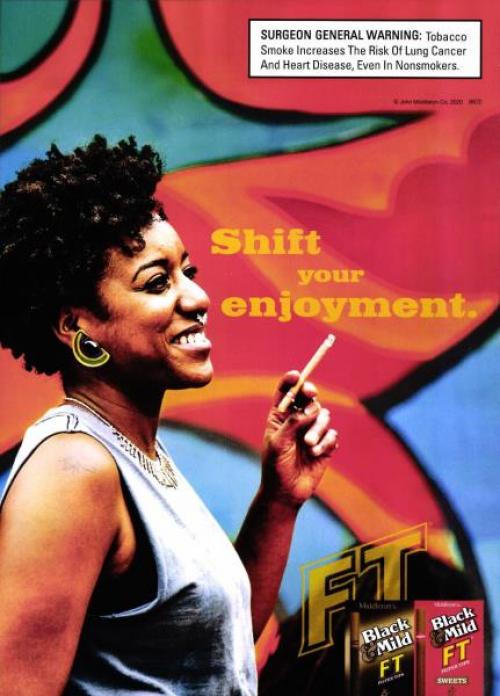 Magazine ad promoting Black & Mild's filter tip cigars, in sweets flavor and regular. Shows a woman holding a cigar against a bright, bold background with the copy, "Shift your enjoyment."