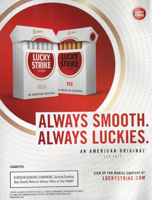 Magazine ad for Lucky Strike cigarettes that mentions the availability of mobile coupons on the brand website. Text: "Always smooth. Always Luckies."