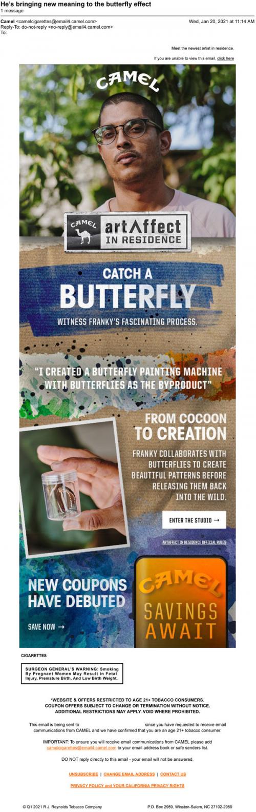 Email from Camel in January 2021 introducing an artist from the most recent art Affect project, a man who paints with butterflies and releases them into the wild. Links to the brand website to enter the studio and learn more. Also includes a reminder to claim new coupons.