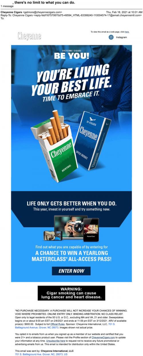 Email from Cheyenne cigars in February 2021 promoting the Be You sweepstakes, where participants have the chance to win a MasterClass pass and learn new skills. Includes positive messages, like "You're living your best life. Time to embrace it."