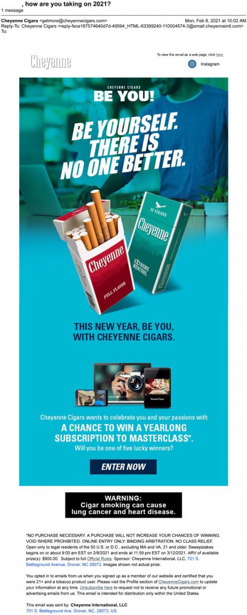 Email from Cheyenne cigars in February 2021 promoting the Be You