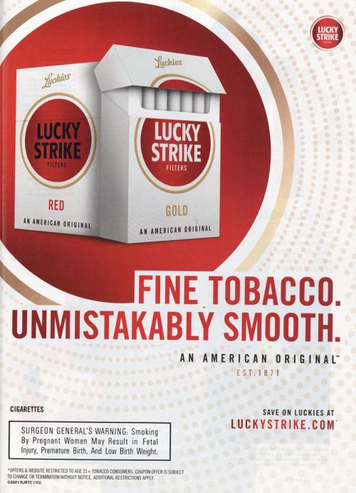 Lucky Strike cigarettes that invites the viewer to save on their product by visiting the brand website. Text: "Fine Tobacco. Unmistakably smooth."