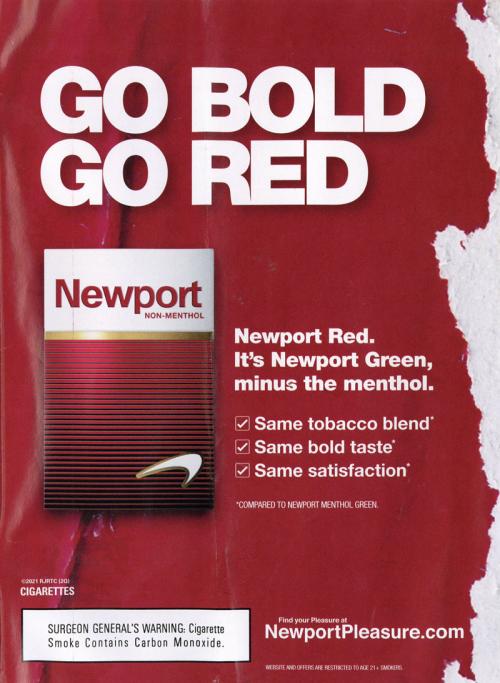 Magazine ad promoting Newport's Red box, saying "It's Newport Green, minus the menthol." This ad seems timely considering the FDA's recent plan to restrict menthol in tobacco. Text: "Go Bold Go Red"