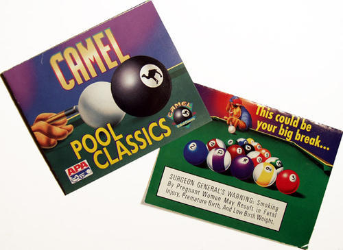 Camel and the American Poolplayers Association offer to join and get pool stuff with C Notes. "Camel pool classics" Camel hand shooting cue ball into black ball with a camel on the ball instead of the "8".