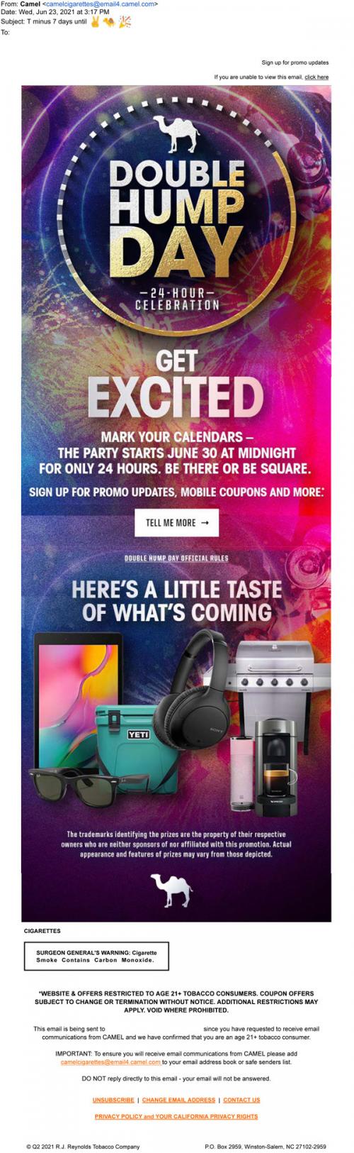 Email from Camel in June 2021 promoting their Double Hump Day event, a limited time 24 hour sweepstakes on June 30th. Provides a link to learn more on the brand website and shows some images of potential prizes to win.
