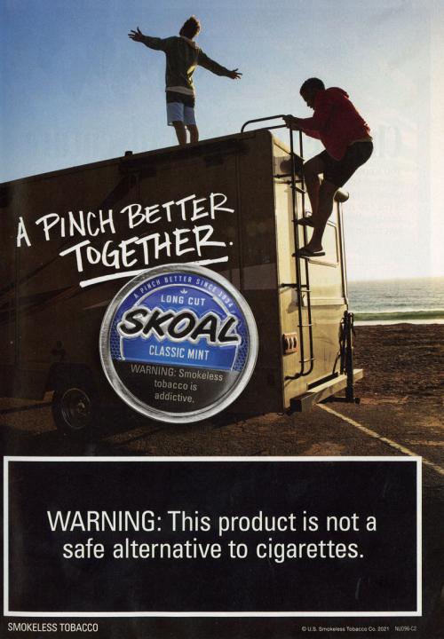Magazine ad promoting Skoal mint smokeless tobacco. Shows two men climbing onto the top of a camper. Text: "A pinch better together."