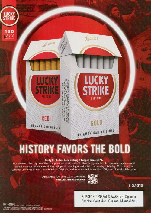 Lucky Strike magazine ad highlighting the history of the brand and their 150 years of existence. Directs the viewer to the brand website and includes a QR code to access with a mobile phone. Text: "History favors the bold."