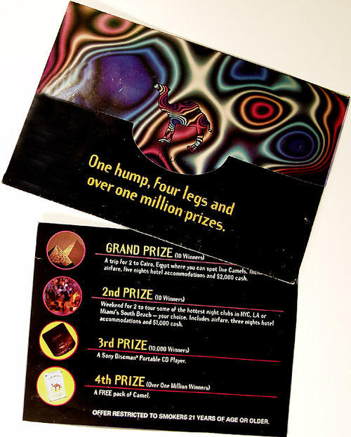 Direct mail sweepstakes from Camel, black and psychedelic swirls.