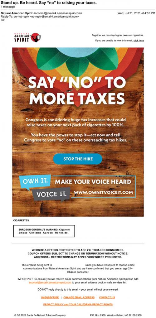 Email from American Spirit in July 2021 urging the recipient to visit the "Own It. Voice it." campaign to let Congress know about smoker opposition to huge tax increases on all nicotine products.